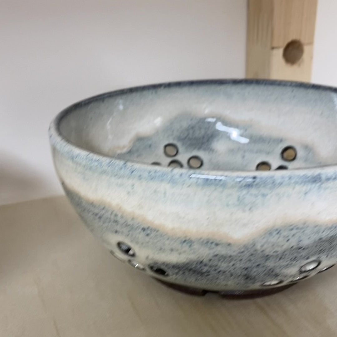 Made from brown stoneware with a white/ blue glaze. 7x16cm
