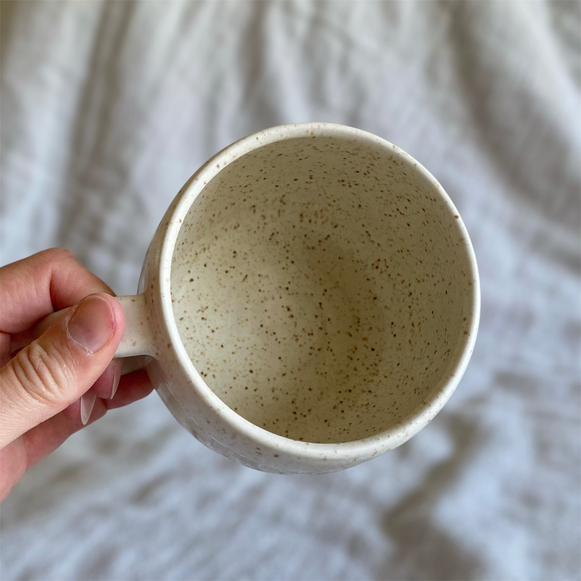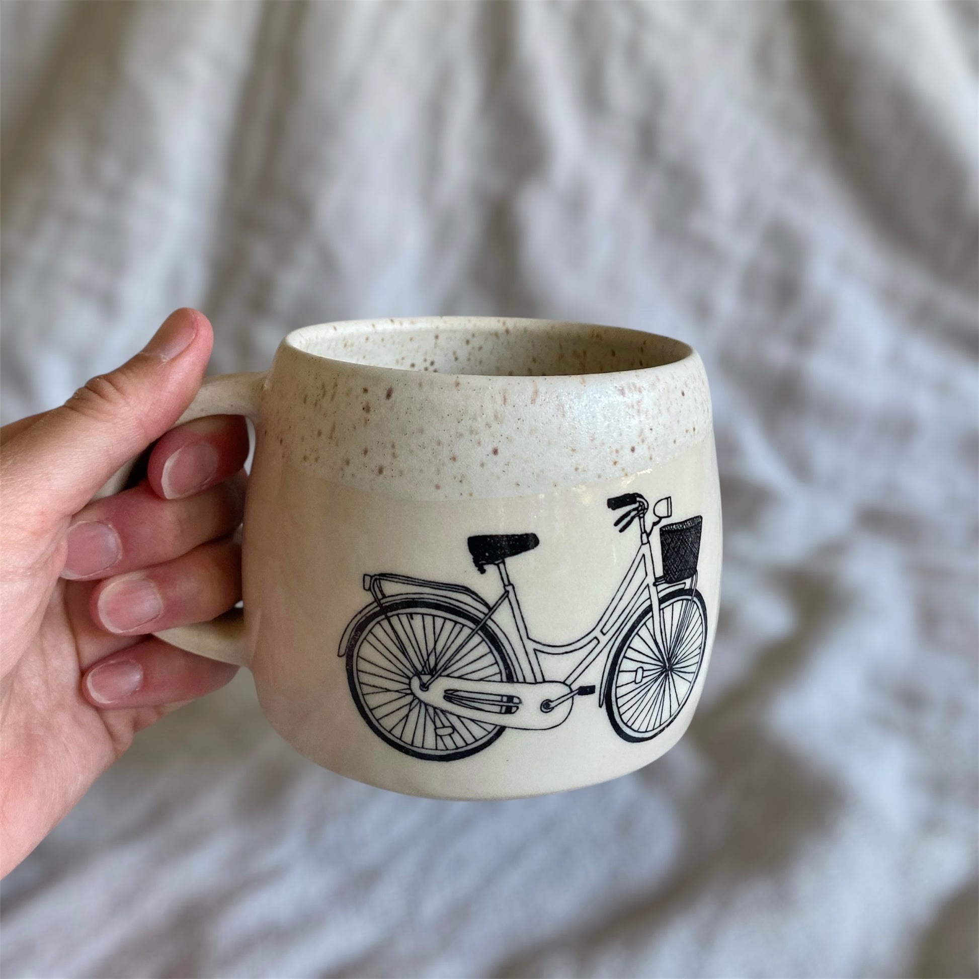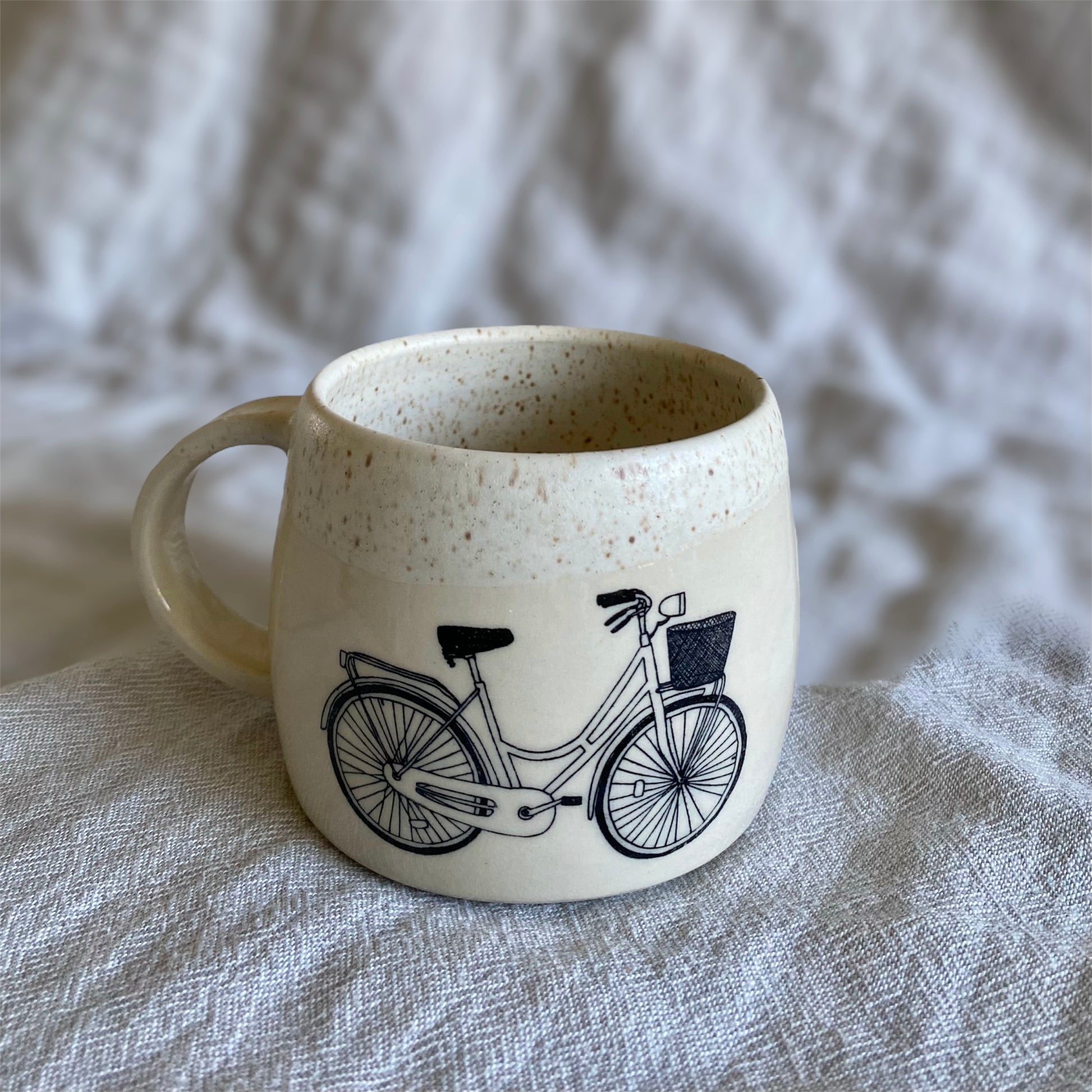 This bike mug is thrown on the potter's wheel. A bike underglaze transfer is applied and it is hand glazed with a speckled off-white glaze.
