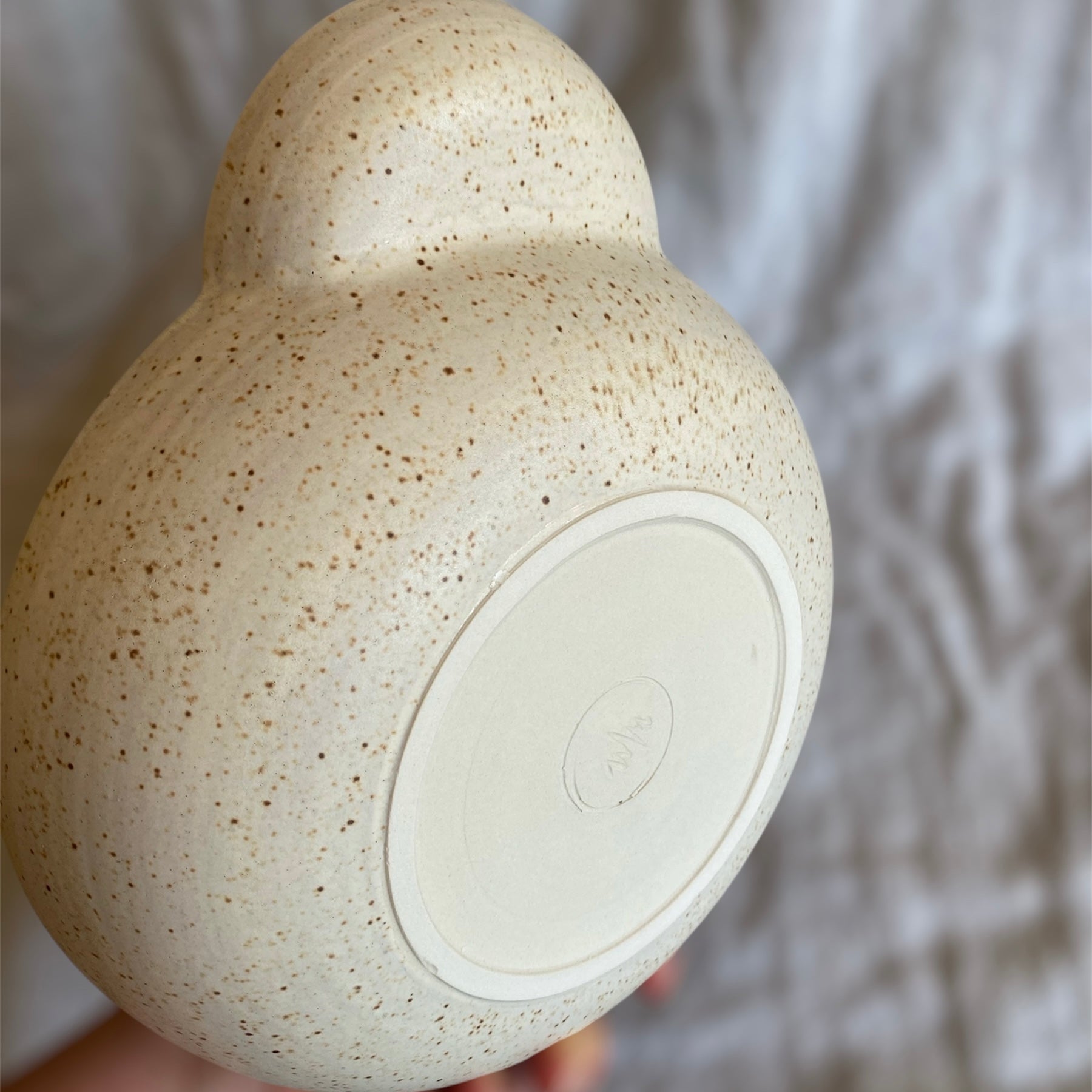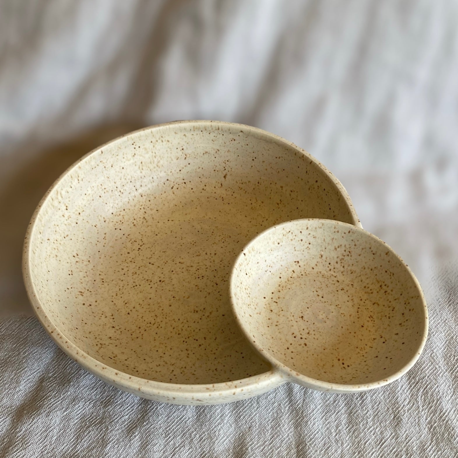 This chip and dip bowl is made from white stoneware with an off-white speckled glaze.