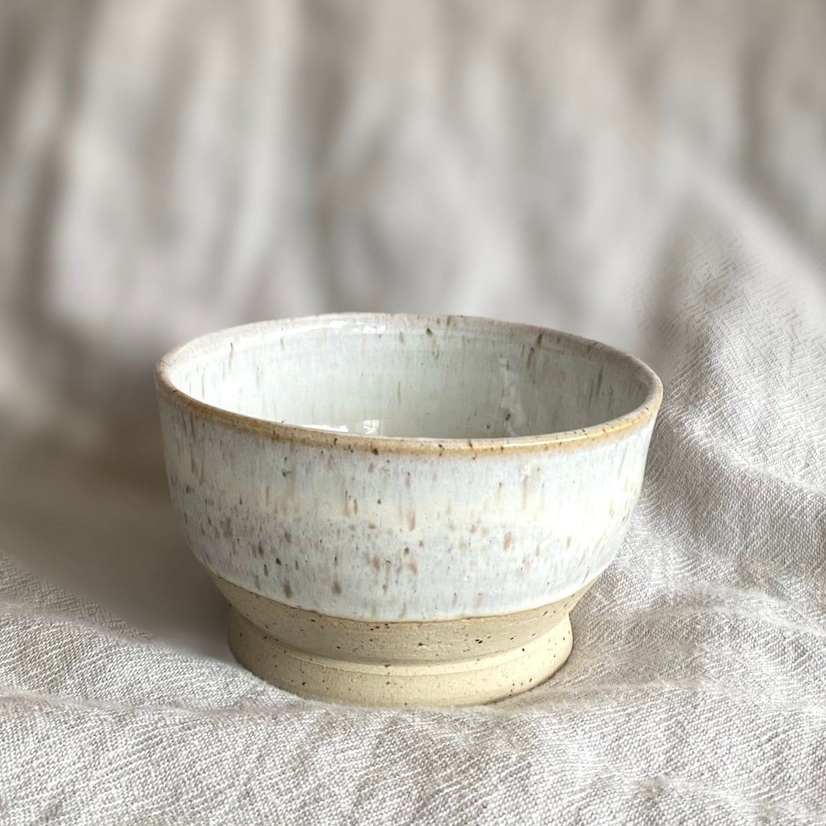 This sweet little berry bowl is made from speckled stoneware and glazed in a beautiful creamy white glaze with honey streaks. It is 7x12cm.