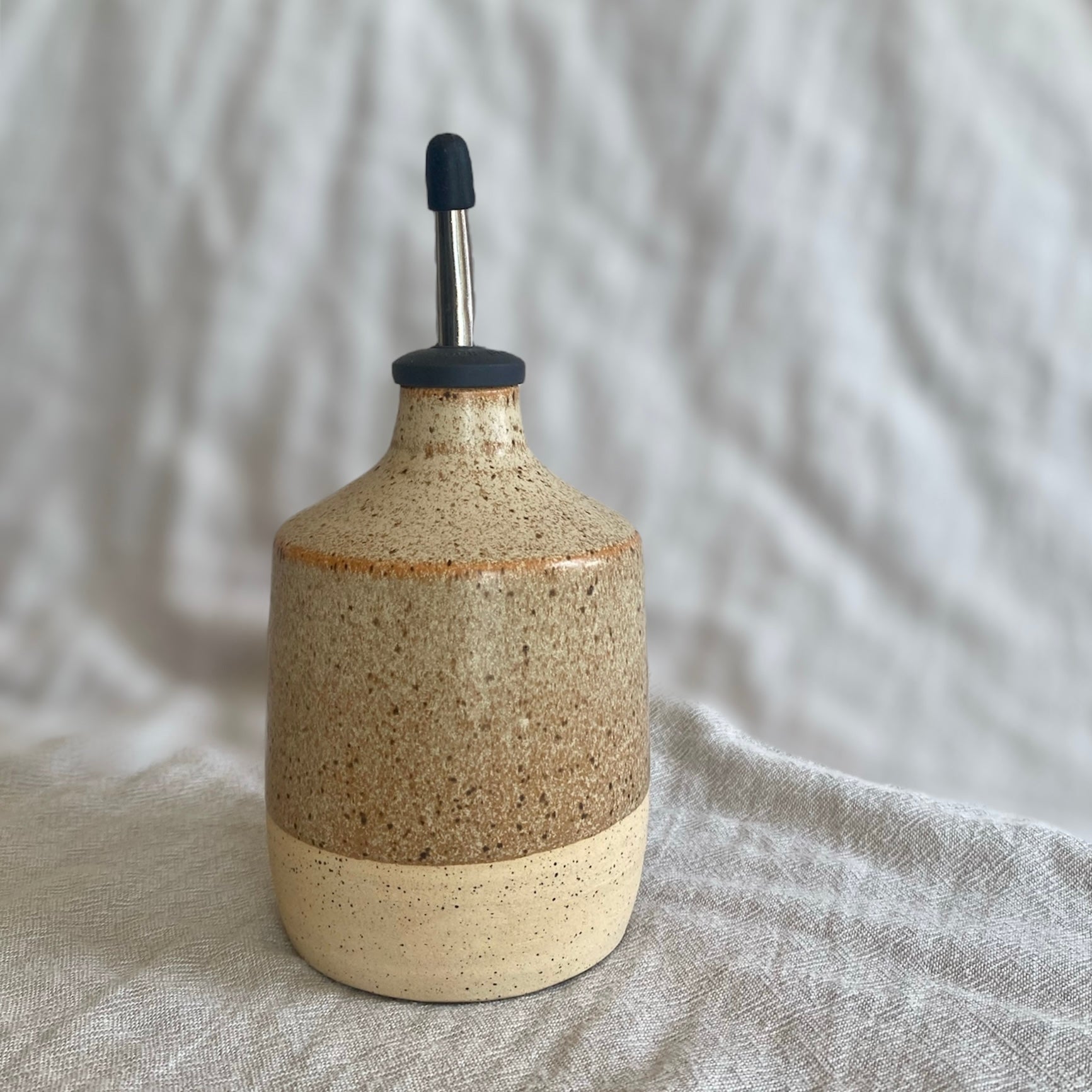 This rustic oil bottle is made from speckled stoneware and finished with a nutmeg glaze.