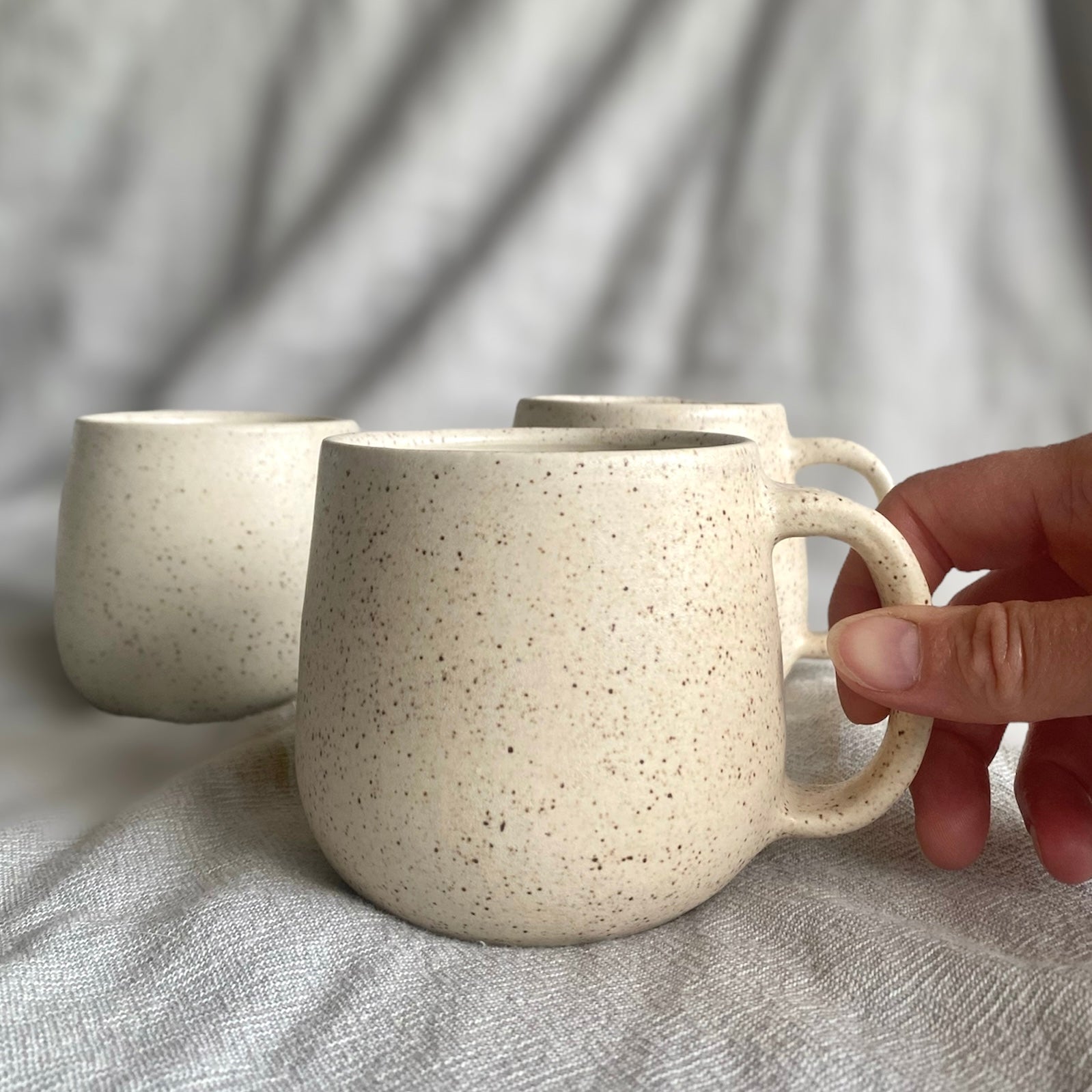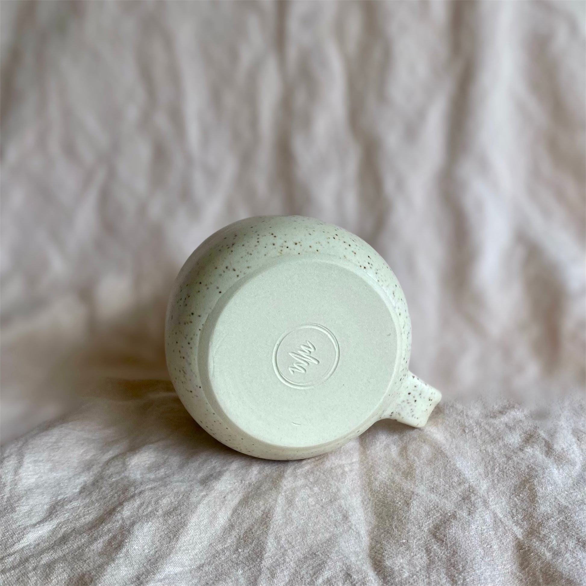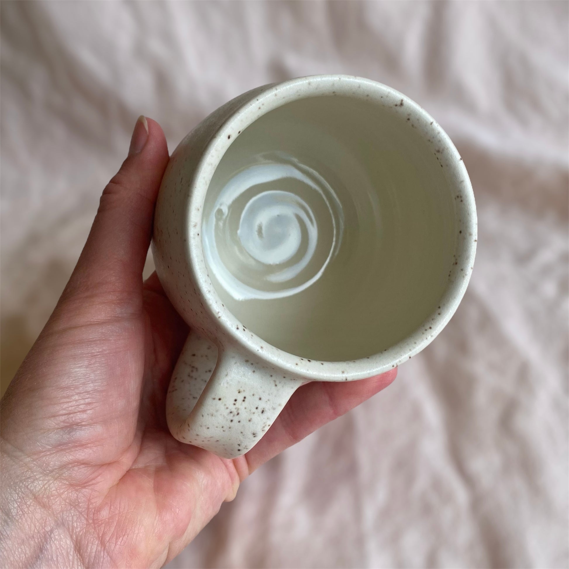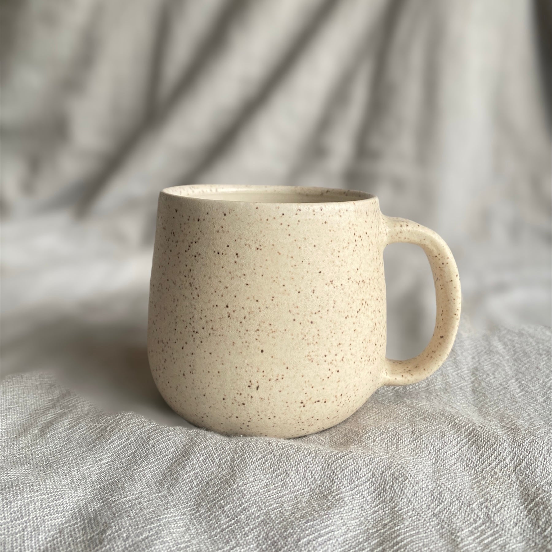 This mug is made from white stoneware and glazed with an off white speckled glaze and a clear glaze inside. Dimensions: 8.5x8cm, holds 350ml